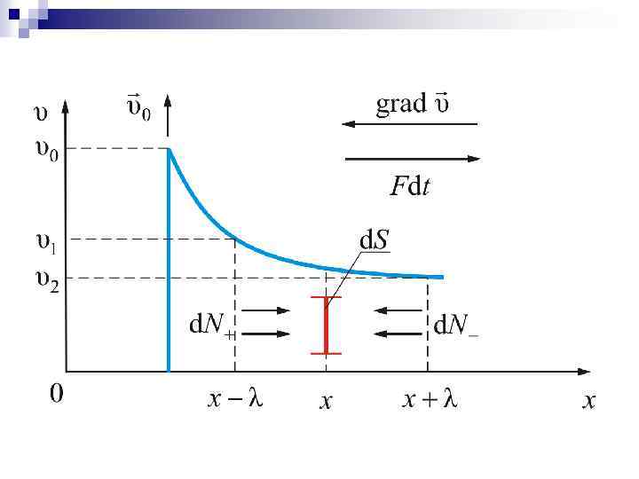 N=N 1'-N 1'' (12. 11) (12. 12) где n 1' концентрация молекул слева от площади, а n 2'' концентрация молекул справа от площади. Через поверхность S, будут пролетать молекулы, претерпевшие последнее соударение на различных расстояниях от S. Однако в среднем последнее соударение происходит на расстоянии от S, равном средней длине свободного пробега . Поэтому в качестве n 1' разумно взять значение n 1(x- ), а в качестве n 2'' – значение n 1(x+ ). Тогда с учетом (12. 11) (12. 13)