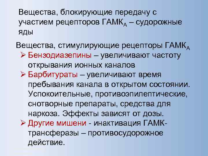 Вещества, блокирующие передачу с участием рецепторов ГАМКA – судорожные яды Вещества, стимулирующие рецепторы ГАМКA Ø Бензодиазепины – увеличивают частоту открывания ионных каналов Ø Барбитураты – увеличивают время пребывания канала в открытом состоянии. Успокоительные, противоэпилептические, снотворные препараты, средства для наркоза. Эффекты зависят от дозы. Ø Другие мишени - инактивация ГАМКтрансферазы – противосудорожное действие. Дневное отделение фармацевтического факультета