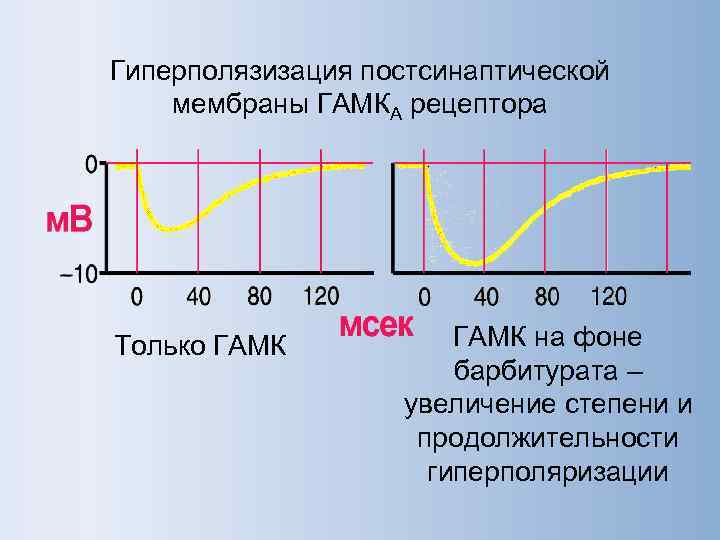 Гиперполязизация постсинаптической мембраны ГАМКА рецептора Только ГАМК на фоне барбитурата – увеличение степени и продолжительности гиперполяризации