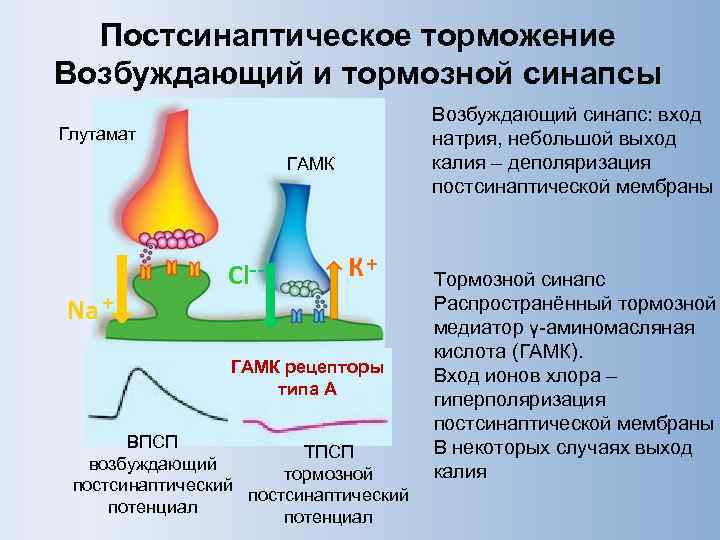 Постсинаптическое торможение Возбуждающий и тормозной синапсы Возбуждающий синапс: вход натрия, небольшой выход калия – деполяризация постсинаптической мембраны Глутамат ГАМК Na + Cl-- К+ ГАМК рецепторы типа А ВПСП ТПСП возбуждающий тормозной постсинаптический потенциал Тормозной синапс Распространённый тормозной медиатор γ-аминомасляная кислота (ГАМК). Вход ионов хлора – гиперполяризация постсинаптической мембраны В некоторых случаях выход калия