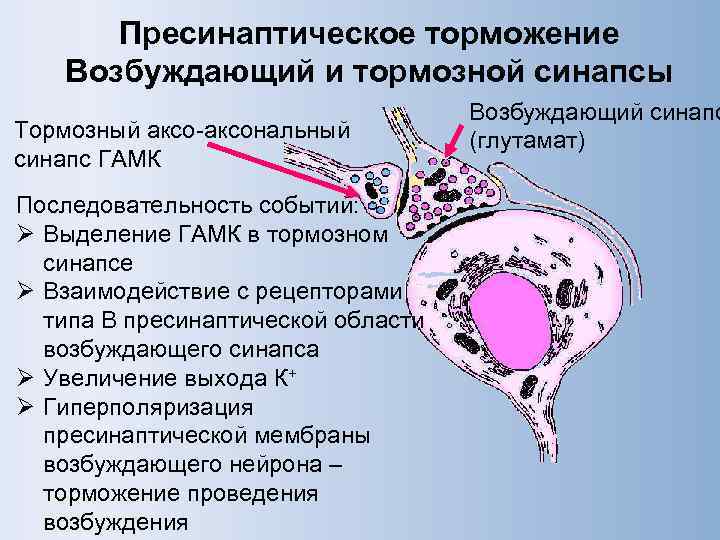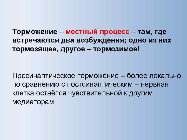 Торможение – местный процесс – там, где встречаются два возбуждения; одно из них тормозящее, другое – тормозимое! Пресинаптическое торможение – более локально по сравнению с постсинаптическим – нервная клетка остаётся чувствительной к другим медиаторам