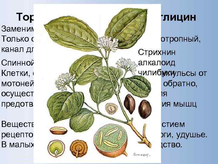 Тормозная аминокислота глицин Заменимая пищевая аминокислота. Только один глициновый рецептор - ионотропный, канал для хлора. Стрихнин алкалоид Спинной мозг: чилибухи Клетки, содержащие глицин, получают импульсы от мотонейронов, их аксоны направляются обратно, осуществляя возвратное торможение для предотвращения чрезмерного сокращения мышц Вещества, блокирующие передачу с участием рецепторов глицина – стрихнин – судороги, удушье. В малых дозах – как тонизирующее средство. Дневное отделение фармацевтического факультета