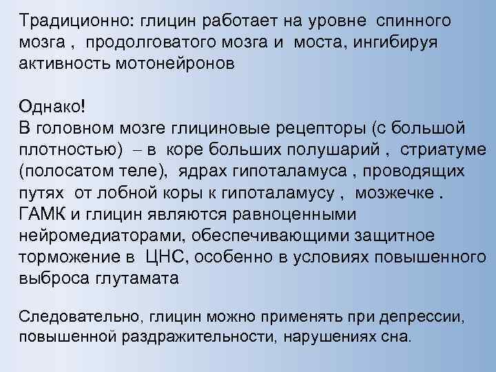 Традиционно: глицин работает на уровне спинного мозга , продолговатого мозга и моста, ингибируя активность мотонейронов Однако! В головном мозге глициновые рецепторы (с большой плотностью) ‒ в коре больших полушарий , стриатуме (полосатом теле), ядрах гипоталамуса , проводящих путях от лобной коры к гипоталамусу , мозжечке. ГАМК и глицин являются равноценными нейромедиаторами, обеспечивающими защитное торможение в ЦНС, особенно в условиях повышенного выброса глутамата Следовательно, глицин можно применять при депрессии, повышенной раздражительности, нарушениях сна.