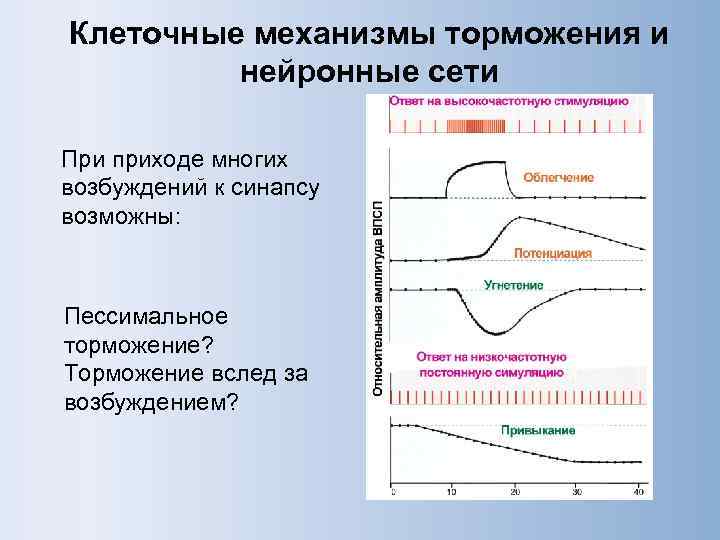Клеточные механизмы торможения и нейронные сети При приходе многих возбуждений к синапсу возможны: Пессимальное торможение? Торможение вслед за возбуждением?