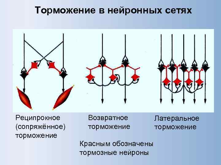 Торможение в нейронных сетях Реципрокное (сопряжённое) торможение Возвратное торможение Красным обозначены тормозные нейроны Латеральное торможение