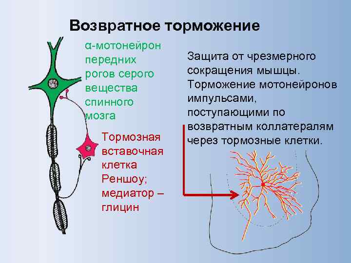 Возвратное торможение α-мотонейрон передних рогов серого вещества спинного мозга Тормозная вставочная клетка Реншоу; медиатор – глицин Защита от чрезмерного сокращения мышцы. Торможение мотонейронов импульсами, поступающими по возвратным коллатералям через тормозные клетки.
