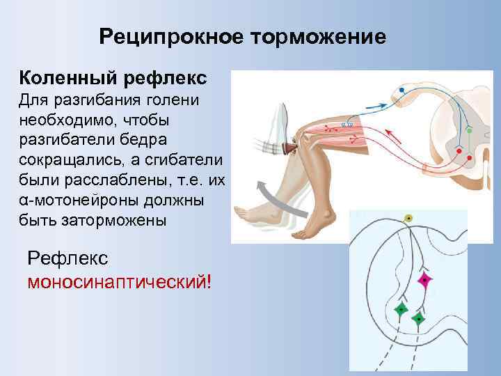 Реципрокное торможение Коленный рефлекс Для разгибания голени необходимо, чтобы разгибатели бедра сокращались, а сгибатели были расслаблены, т. е. их α-мотонейроны должны быть заторможены Рефлекс моносинаптический!