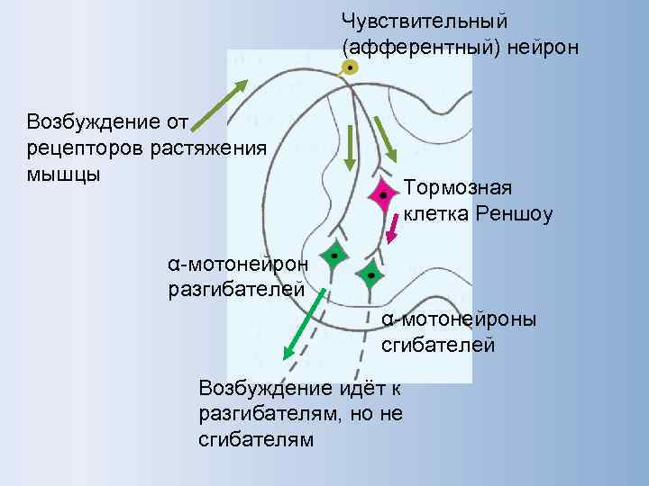 Чувствительный (афферентный) нейрон Возбуждение от рецепторов растяжения мышцы Тормозная клетка Реншоу α-мотонейрон разгибателей α-мотонейроны сгибателей Возбуждение идёт к разгибателям, но не сгибателям