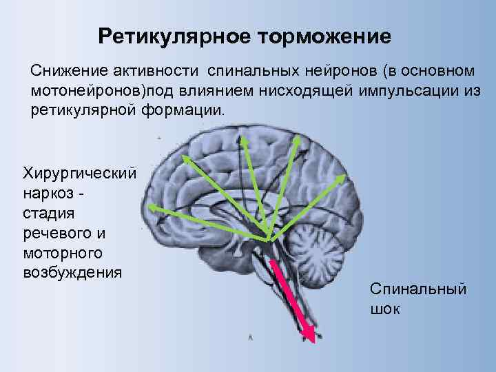 Ретикулярное торможение Снижение активности спинальных нейронов (в основном мотонейронов)под влиянием нисходящей импульсации из ретикулярной формации. Хирургический наркоз стадия речевого и моторного возбуждения Спинальный шок