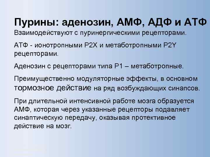 Пурины: аденозин, АМФ, АДФ и АТФ Взаимодействуют с пуринергическими рецепторами. АТФ - ионотропными P 2 X и метаботропными P 2 Y рецепторами. Аденозин с рецепторами типа P 1 – метаботропные. Преимущественно модуляторные эффекты, в основном тормозное действие на ряд возбуждающих синапсов. При длительной интенсивной работе мозга образуется АМФ, которая через указанные рецепторы подавляет синаптическую передачу, оказывая протективное действие на мозг. Дневное отделение фармацевтического факультета