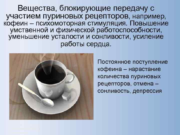 Вещества, блокирующие передачу с участием пуриновых рецепторов, например, кофеин – психомоторная стимуляция. Повышение умственной и физической работоспособности, уменьшение усталости и сонливости, усиление работы сердца. Постоянное поступление кофеина – нарастание количества пуриновых рецепторов, отмена – сонливость, депрессия Дневное отделение фармацевтического факультета