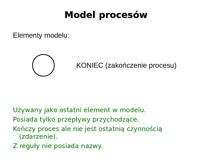 Model procesów Używany jako ostatni element w modelu. Posiada tylko przepływy przychodzące. Kończy proces ale nie jest ostatnią czynnością (zdarzenie). Z reguły nie posiada nazwy. Elementy modelu: KONIEC (zakończenie procesu)