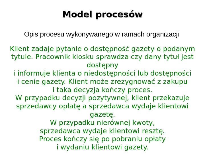 Model procesów Klient zadaje pytanie o dostępność gazety o podanym tytule. Pracownik kiosku sprawdza czy dany tytuł jest dostępny i informuje klienta o niedostępności lub dostępności i cenie gazety. Klient może zrezygnować z zakupu i taka decyzja kończy proces. W przypadku decyzji pozytywnej, klient przekazuje sprzedawcy opłatę a sprzedawca wydaje klientowi gazetę. W przypadku nierównej kwoty, sprzedawca wydaje klientowi resztę. Proces kończy się po pobraniu opłaty i wydaniu klientowi gazety. Opis procesu wykonywanego w ramach organizacji