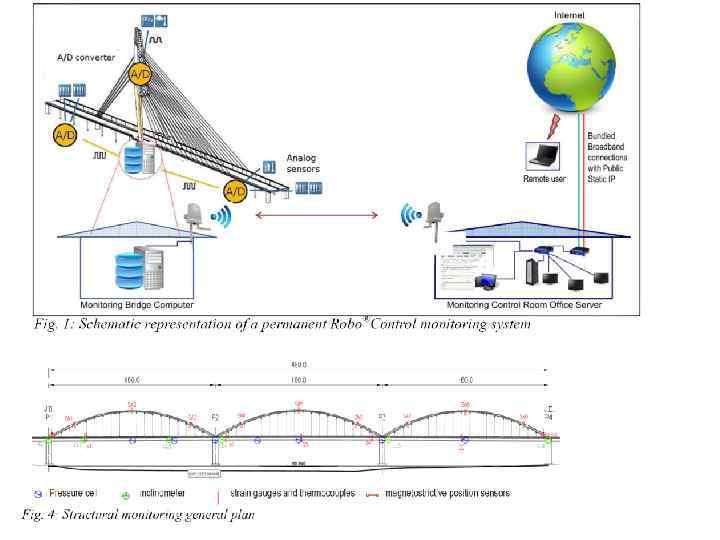 Схема автоматизации мониторинга – роботизированный тахеометр; – глубинный знак опорной сети; – ориентирный глубинный знак на основе обратного отвеса; – оптический отражатель на конструкции моста; – видеодатчик системы контроля колебаний пролётов и пилонов моста; – система видеогидростатического нивелирования для контроля высотных деформаций опор моста; – точечный источник света; – инклинометр; – метеодатчик.