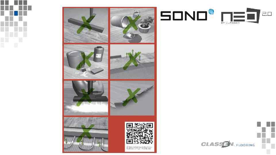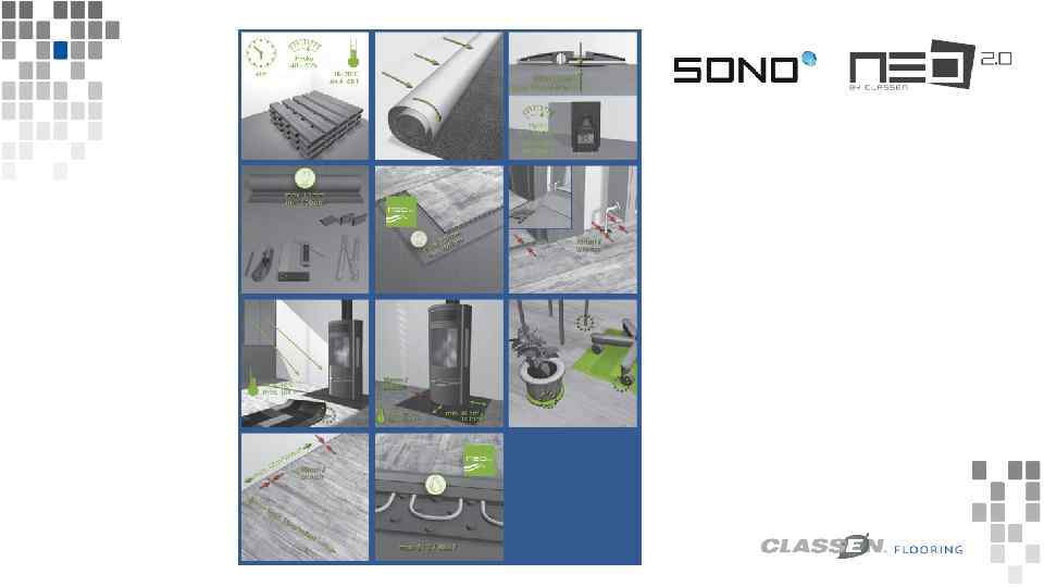 1. Подготовка к монтажу 1. 1 До начала монтажа необходима акклиматизация напольного покрытия в течение 48 часов при комнатной температуре 18°C - 20°C и относительной влажности от 40% до максимум 60%. 1. 2 Перед началом установки ламели должны быть проверены на предмет происхождения из одной партии и наличие дефектов. Панели для пола с видимыми дефектами не должны использоваться. 1. 3 Удалите все старые напольные покрытия, которые являются мягкими или водопроницаемыми, такие как ковры, войлочные или виниловые покрытия. 1. 4 Защита и подготовка основания 1. 4. 1 Поверхность должна быть прочной, чистой, ровной и сухой. 1. 5. Монтаж на полы с подогревом на водной основе Напольные покрытия NEO/SONO возможно укладывать на подогреваемую на водной основе поверхность. Перед установкой необходимо выполнить функциональный и первоначальный нагрев поверхности пола в согласно правилам укладки напольного покрытия (см. , например, техническую информацию «Координация соединений на подогреваемых поверхностях» www. zdb. de). ПРИМЕЧАНИЕ. Как правило, установка напольных покрытий на электрические системы подогрева не рекомендуется. Контактная температура с напольным покрытием не должна превышать 27 ° C