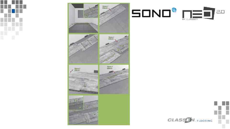 1. 6. Руководство по монтажу Торец половицы монтируется в направлении основного источника света. В случае длинных, узких комнат– в продольном направлении. 2. 0 Необходимые инструменты и приспособления 2. 1 Приспособления: Рулетка, карандаш, нож с трапециевидным лезвием. Дополнительно: резиновый молот, нож для резки металлических предметов, столярная пила 2. 3 Инструменты: распорки и звукоизоляционная подложка NEO-LAY. Примечание: Мы рекомендуем использовать звукоизоляционную подложку NEO-LAY, специально созданную для системы NEO/SONO. Эта подложка соответствует самым высоким эргономическим стандартам. Кроме того, она оптимально подавляет шум, создаваемый при ходьбе и шум, исходящий из комнат. 3. Укладка Система NEO/SONO разработана для плавающей укладки и может быть установлена , согласно описанию, содержащемуся в п 3. 2. Основные указания по установке: - Максимальная длина / ширина помещения без дополнительных компенсационных соединений не должна превышать 12 м. - Ширина доски пола в первом и последнем ряду должна быть не менее 8 см. - Смещение поперечных стыков должно составлять не менее 1/3 длины одной половицы. - Если вы используете резиновый молоток при монтаже, действуйте очень осторожно и обращайте внимание, на то что компоненты / разъемы не повреждаются при ударе. 3. 1 Плавающая установка Запатентованная система укладки «CLASSEN Megaloc» обеспечивает быструю и легкую укладку системы NEO/SONO. 3. 1. 1 Расширительные швы / плавающая укладка При всех недостатках, связанных со строительными нюансами, а также в проходах к другим помещениям или переходах к другим типам напольных покрытий, оставляйте со всех сторон расширительные зазоры, размером 10 мм. Двери и дверные коробки должны быть подрезаны настолько, чтобы было возможно вставить под них конструкцию с учетом звукоизоляционной подложки.