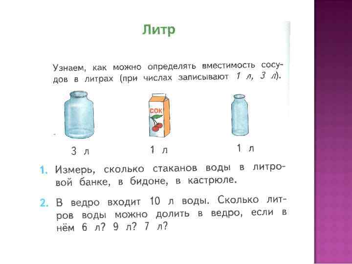 Вместимость надо определять одинаковой меркой. Определяют вместимость ( или по-другому объём) сосудов в литрах.
