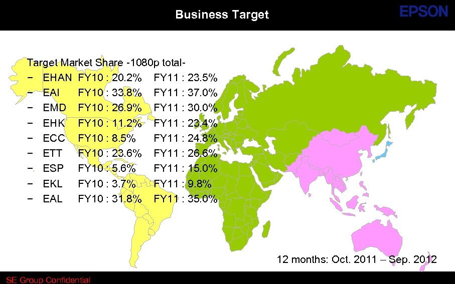 Business Target Market Share -1080 p total− EHAN FY 10 : 20. 2% FY 11 : 23. 5% − EAI FY 10 : 33. 8% FY 11 : 37. 0% − EMD FY 10 : 26. 9% FY 11 : 30. 0% − EHK FY 10 : 11. 2% FY 11 : 23. 4% − ECC FY 10 : 8. 5% FY 11 : 24. 8% − ETT FY 10 : 23. 6% FY 11 : 26. 6% − ESP FY 10 : 5. 6% FY 11 : 15. 0% − EKL FY 10 : 3. 7% FY 11 : 9. 8% − EAL FY 10 : 31. 8% FY 11 : 35. 0% 12 months: Oct. 2011 – Sep. 2012 SE Group Confidential