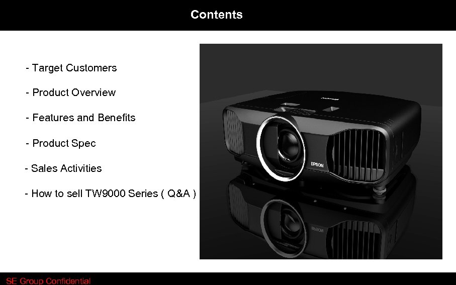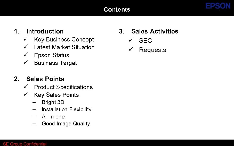 Contents 1. Introduction ü ü 2. Key Business Concept Latest Market Situation Epson Status Business Target Sales Points ü ü Product Specifications Key Sales Points – – Bright 3 D Installation Flexibility All-in-one Good Image Quality SE Group Confidential 3. Sales Activities ü SEC ü Requests