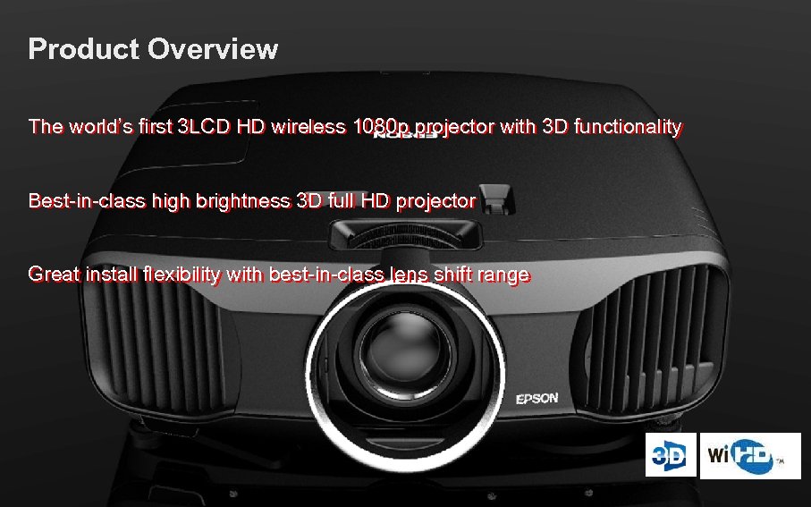 Product Overview The world’s first 3 LCD HD wireless 1080 p projector with 3 D functionality Best-in-class high brightness 3 D full HD projector Great install flexibility with best-in-class lens shift range SE Group Confidential