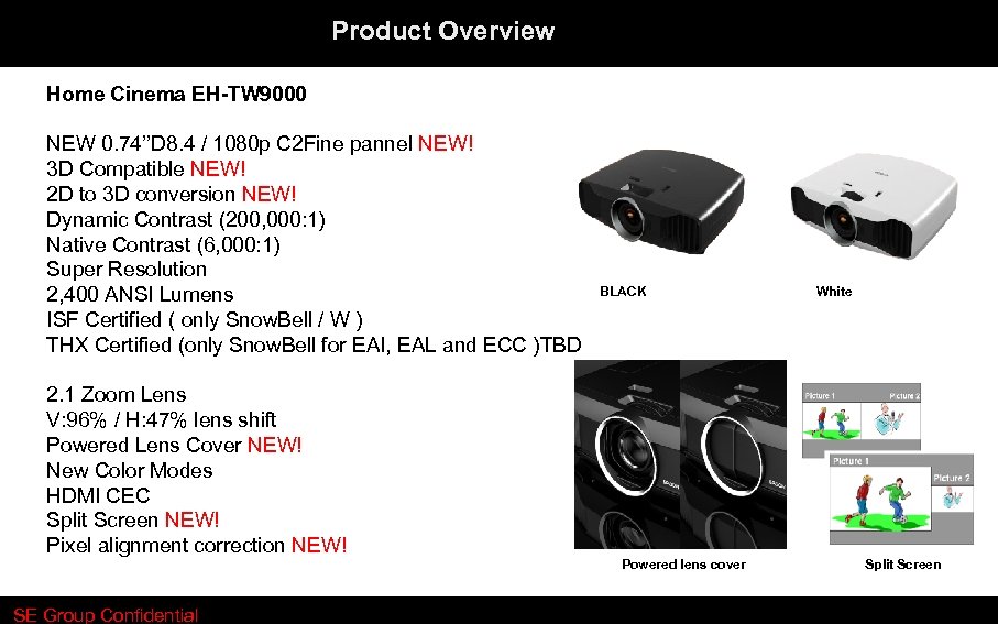 Product Overview Home Cinema EH-TW 9000 NEW 0. 74’’D 8. 4 / 1080 p C 2 Fine pannel NEW! 3 D Compatible NEW! 2 D to 3 D conversion NEW! Dynamic Contrast (200, 000: 1) Native Contrast (6, 000: 1) Super Resolution 2, 400 ANSI Lumens ISF Certified ( only Snow. Bell / W ) THX Certified (only Snow. Bell for EAI, EAL and ECC )TBD 2. 1 Zoom Lens V: 96% / H: 47% lens shift Powered Lens Cover NEW! New Color Modes HDMI CEC Split Screen NEW! Pixel alignment correction NEW! SE Group Confidential BLACK Powered lens cover White Split Screen