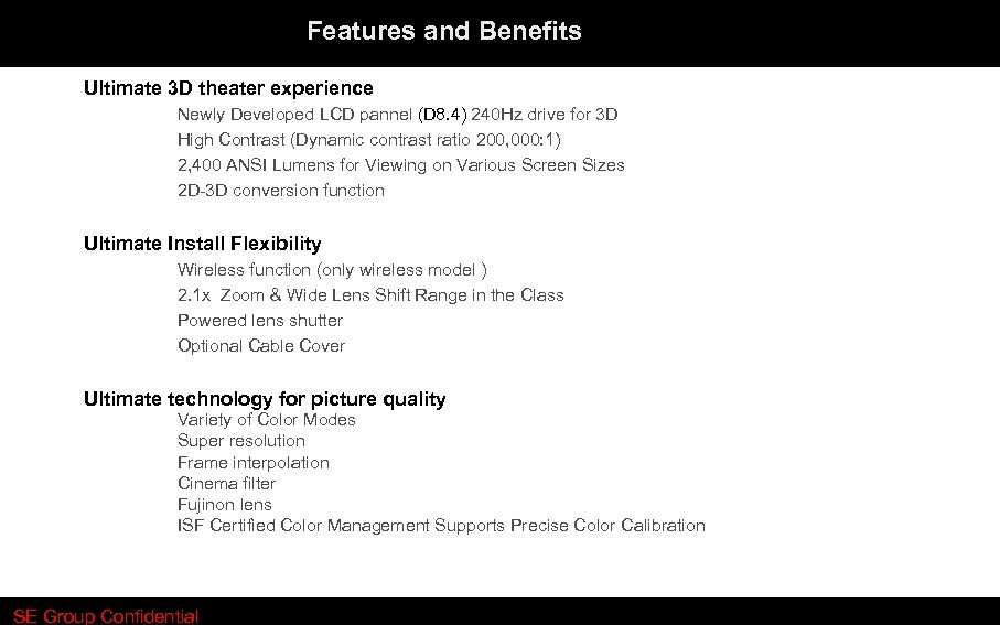 Features and Benefits Ultimate 3 D theater experience Newly Developed LCD pannel (D 8. 4) 240 Hz drive for 3 D High Contrast (Dynamic contrast ratio 200, 000: 1) 2, 400 ANSI Lumens for Viewing on Various Screen Sizes 2 D-3 D conversion function Ultimate Install Flexibility Wireless function (only wireless model ) 2. 1 x Zoom & Wide Lens Shift Range in the Class Powered lens shutter Optional Cable Cover Ultimate technology for picture quality Variety of Color Modes Super resolution Frame interpolation Cinema filter Fujinon lens ISF Certified Color Management Supports Precise Color Calibration SE Group Confidential