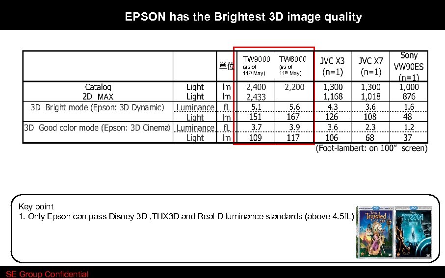 EPSON has the Brightest 3 D image quality TW 9000 TW 6000 (as of 11 th May) Key point 1. Only Epson can pass Disney 3 D , THX 3 D and Real D luminance standards (above 4. 5 f. L) SE Group Confidential