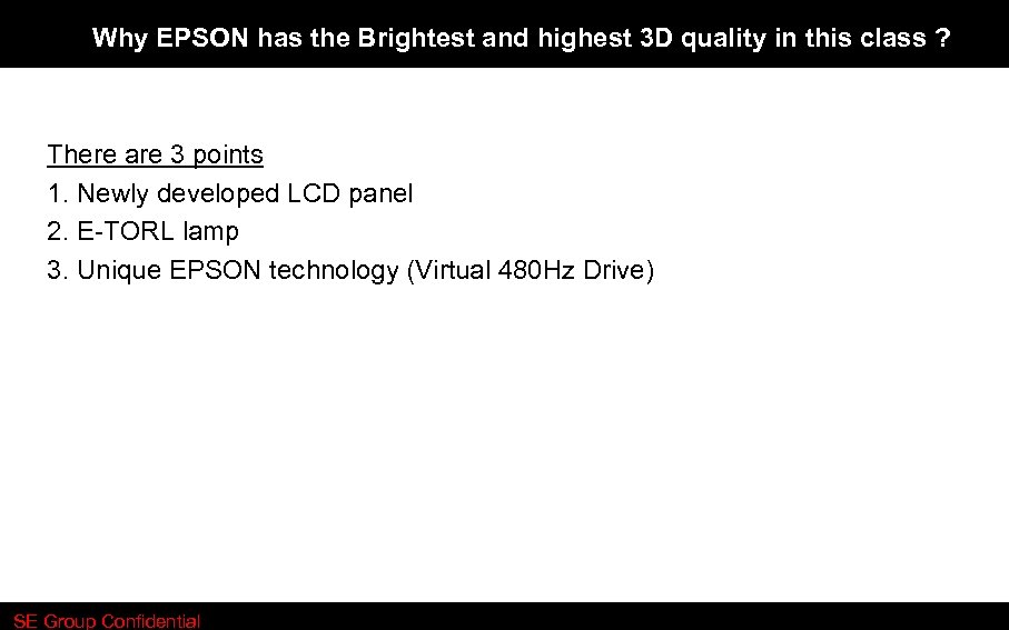 Why EPSON has the Brightest and highest 3 D quality in this class ? There are 3 points 1. Newly developed LCD panel 2. E-TORL lamp 3. Unique EPSON technology (Virtual 480 Hz Drive) SE Group Confidential