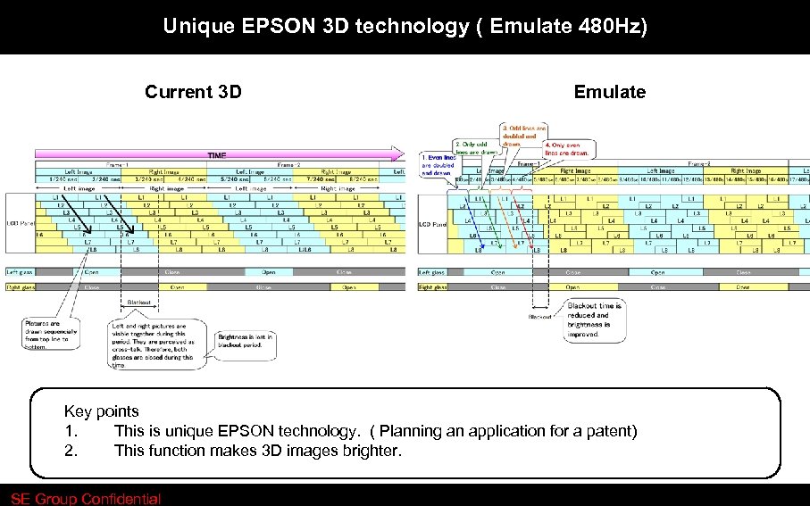 Unique EPSON 3 D technology ( Emulate 480 Hz) Current 3 D Emulate Key points 1. This is unique EPSON technology. ( Planning an application for a patent) 2. This function makes 3 D images brighter. SE Group Confidential