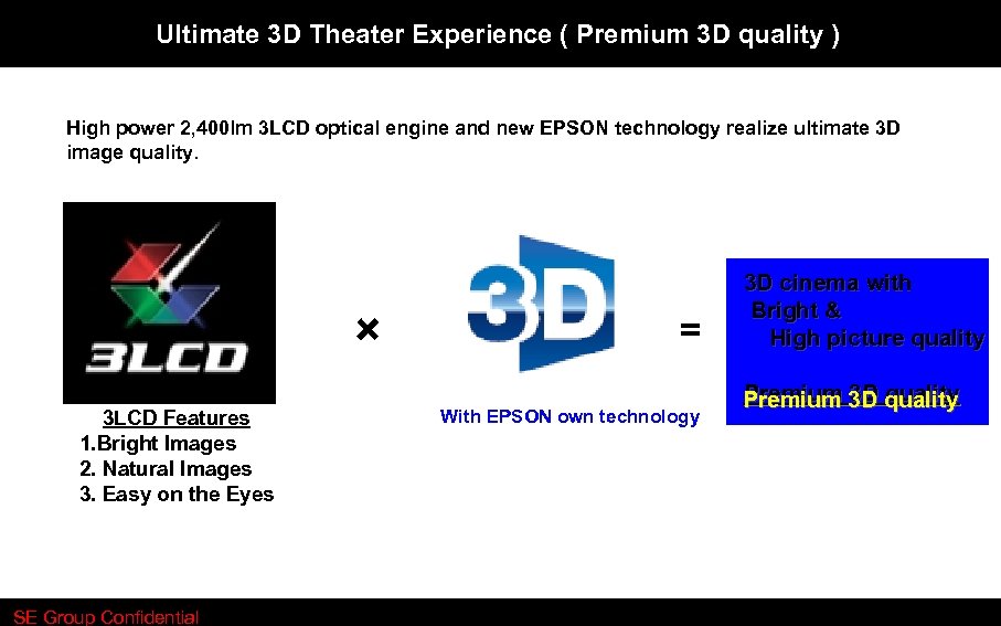 Ultimate 3 D Theater Experience ( Premium 3 D quality ) High power 2, 400 lm 3 LCD optical engine and new EPSON technology realize ultimate 3 D image quality. × 3 LCD Features 1. Bright Images 2. Natural Images 3. Easy on the Eyes SE Group Confidential = With EPSON own technology 3 D cinema with Bright & High picture quality Premium 3 D quality