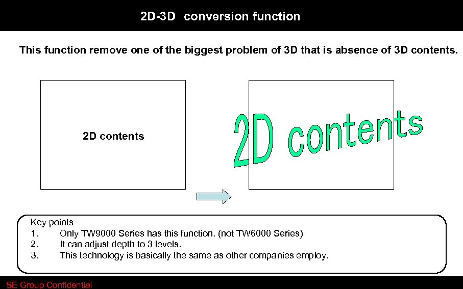 2 D-3 D conversion function This function remove one of the biggest problem of 3 D that is absence of 3 D contents. 2 D contents Key points 1. Only TW 9000 Series has this function. (not TW 6000 Series) 2. It can adjust depth to 3 levels. 3. This technology is basically the same as other companies employ. SE Group Confidential