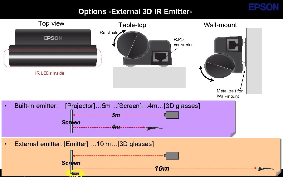 Options -External 3 D IR Emitter. Top view Table-top Wall-mount Rotatable RJ 45 connector IR LEDs inside Metal part for Wall-mount • Built-in emitter: [Projector]… 5 m…[Screen]… 4 m…[3 D glasses] 5 m Screen • 4 m External emitter: [Emitter] … 10 m…[3 D glasses] Screen SE Group Confidential 10 m
