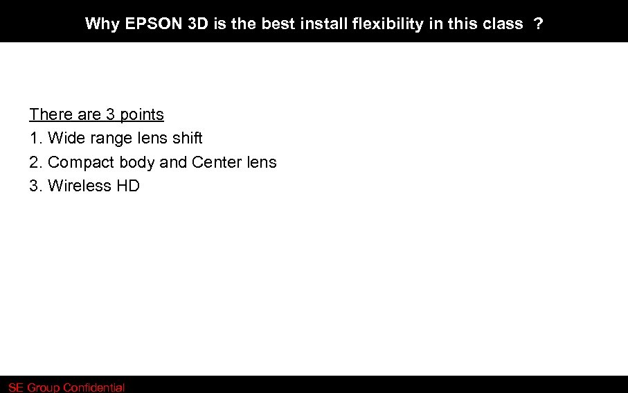Why EPSON 3 D is the best install flexibility in this class ? There are 3 points 1. Wide range lens shift 2. Compact body and Center lens 3. Wireless HD SE Group Confidential