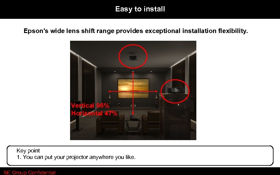 Easy to install Epson's wide lens shift range provides exceptional installation flexibility. Vertical 96% Horizontal 47% Key point 1. You can put your projector anywhere you like. SE Group Confidential