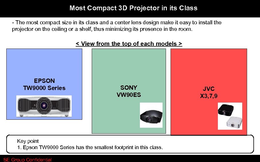 Most Compact 3 D Projector in its Class - The most compact size in its class and a center lens design make it easy to install the projector on the ceiling or a shelf, thus minimizing its presence in the room. < View from the top of each models > EPSON TW 9000 Series SONY VW 90 ES Key point 1. Epson TW 9000 Series has the smallest footprint in this class. SE Group Confidential JVC X 3, 7, 9