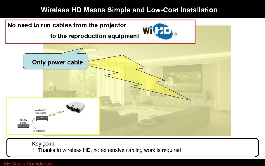 Wireless HD Means Simple and Low-Cost Installation No need to run cables from the projector to the reproduction equipment. Only power cable Key point 1. Thanks to wireless HD, no expensive cabling work is required. SE Group Confidential
