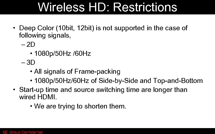 Wireless HD: Restrictions • Deep Color (10 bit, 12 bit) is not supported in the case of following signals, – 2 D • 1080 p/50 Hz /60 Hz – 3 D • All signals of Frame-packing • 1080 p/50 Hz/60 Hz of Side-by-Side and Top-and-Bottom • Start-up time and source switching time are longer than wired HDMI. • We are trying to shorten them. SE Group Confidential