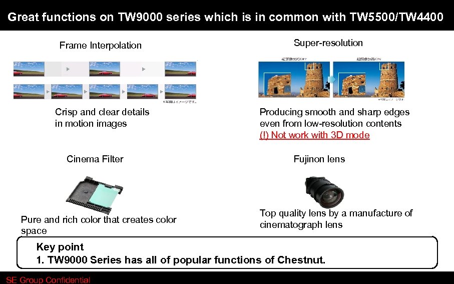Great functions on TW 9000 series which is in common with TW 5500/TW 4400 Frame Interpolation Crisp and clear details in motion images Cinema Filter Pure and rich color that creates color space Super-resolution Producing smooth and sharp edges even from low-resolution contents (!) Not work with 3 D mode Fujinon lens Top quality lens by a manufacture of cinematograph lens Key point 1. TW 9000 Series has all of popular functions of Chestnut. SE Group Confidential