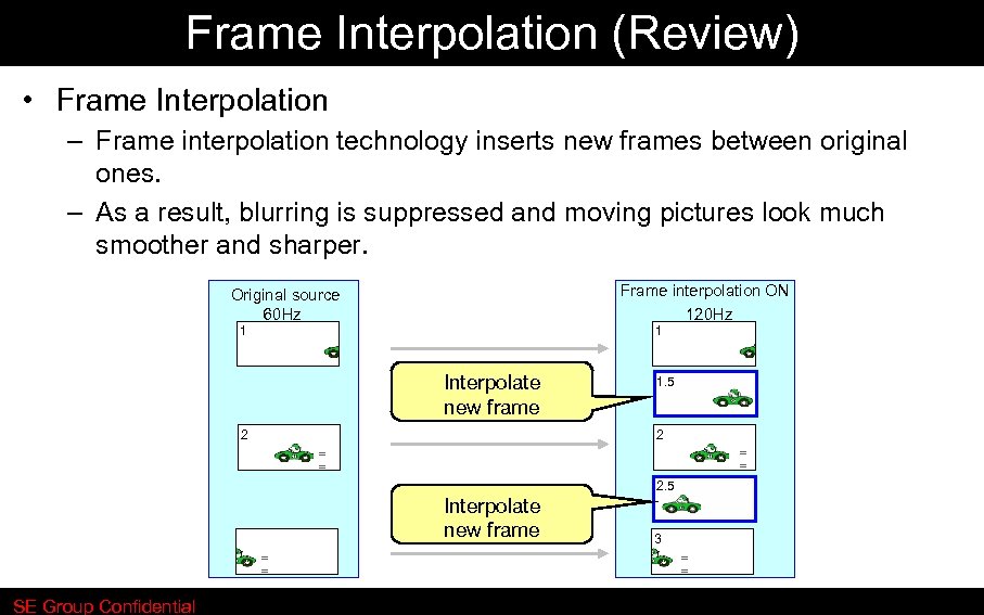 Frame Interpolation (Review) • Frame Interpolation – Frame interpolation technology inserts new frames between original ones. – As a result, blurring is suppressed and moving pictures look much smoother and sharper. Frame interpolation ON 120 Hz Original source 60 Hz 1 1 Interpolate new frame 2 1. 5 2 = = 2. 5 Interpolate new frame 3 SE Group Confidential = = 3 = =