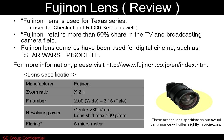 Fujinon Lens ( Review ) • “Fujinon” lens is used for Texas series. – ( used for Chestnut and R 4000 Series as well ) • “Fujinon” retains more than 60% share in the TV and broadcasting camera field. • Fujinon lens cameras have been used for digital cinema, such as “STAR WARS EPISODE III”. For more information, please visit http: //www. fujinon. co. jp/en/index. htm.