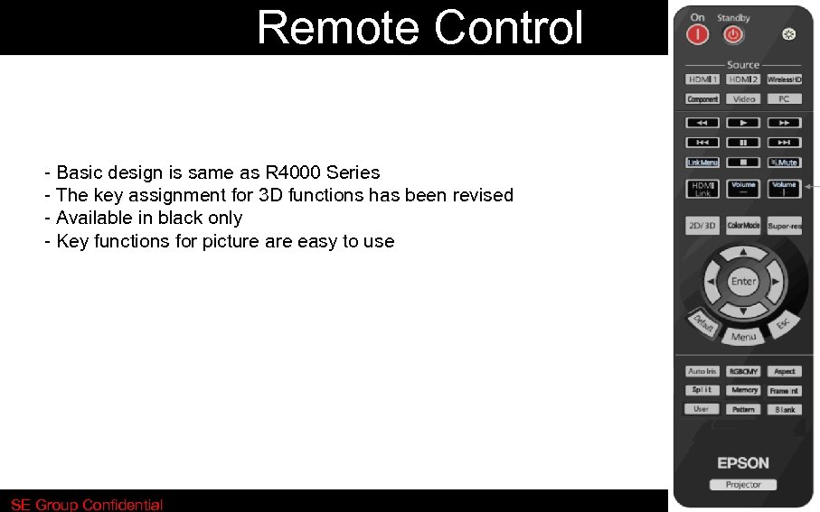 Remote Control - Basic design is same as R 4000 Series - The key assignment for 3 D functions has been revised - Available in black only - Key functions for picture are easy to use SE Group Confidential