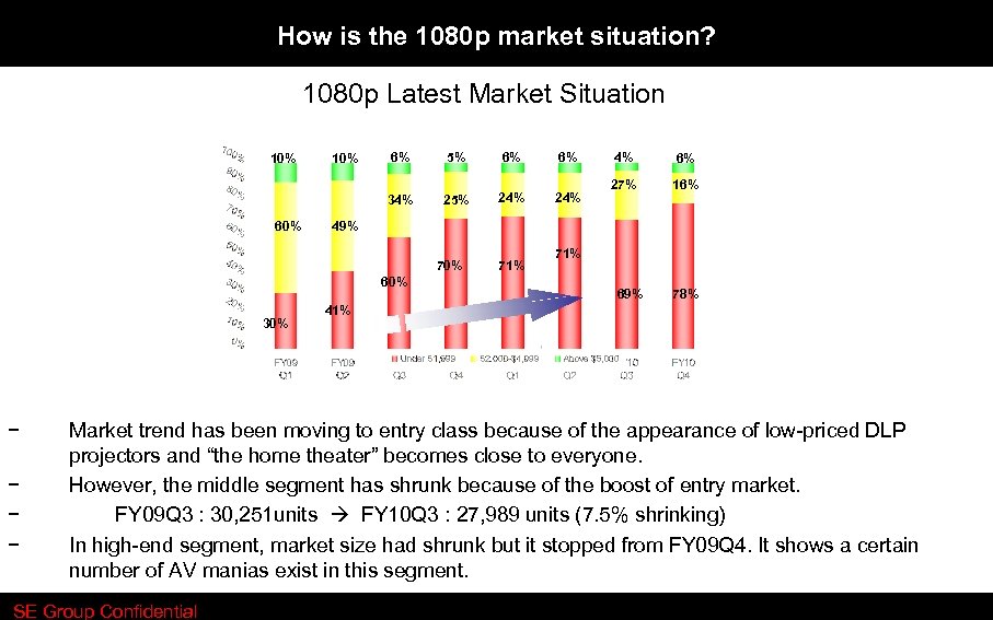How is the 1080 p market situation? 1080 p Latest Market Situation 60% 10% 6% 5% 6% 6% 34% 10% 25% 24% 60% − − 6% 27% 16% 49% 70% 30% 4% 71% 69% 78% 41% Market trend has been moving to entry class because of the appearance of low-priced DLP projectors and “the home theater” becomes close to everyone. However, the middle segment has shrunk because of the boost of entry market. FY 09 Q 3 : 30, 251 units FY 10 Q 3 : 27, 989 units (7. 5% shrinking) In high-end segment, market size had shrunk but it stopped from FY 09 Q 4. It shows a certain number of AV manias exist in this segment. SE Group Confidential Source : Future Source/PMA