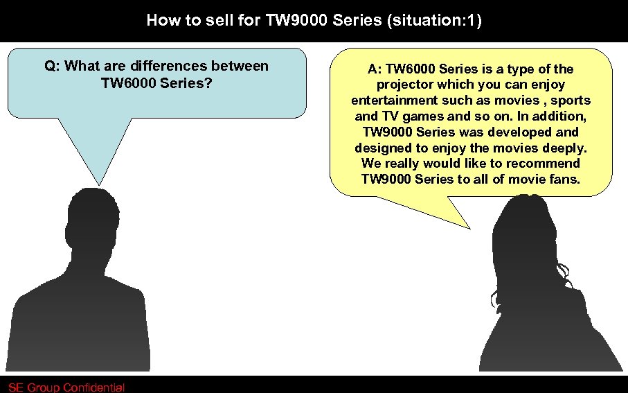 How to sell for TW 9000 Series (situation: 1) Q: What are differences between TW 6000 Series? SE Group Confidential A: TW 6000 Series is a type of the projector which you can enjoy entertainment such as movies , sports and TV games and so on. In addition, TW 9000 Series was developed and designed to enjoy the movies deeply. We really would like to recommend TW 9000 Series to all of movie fans.