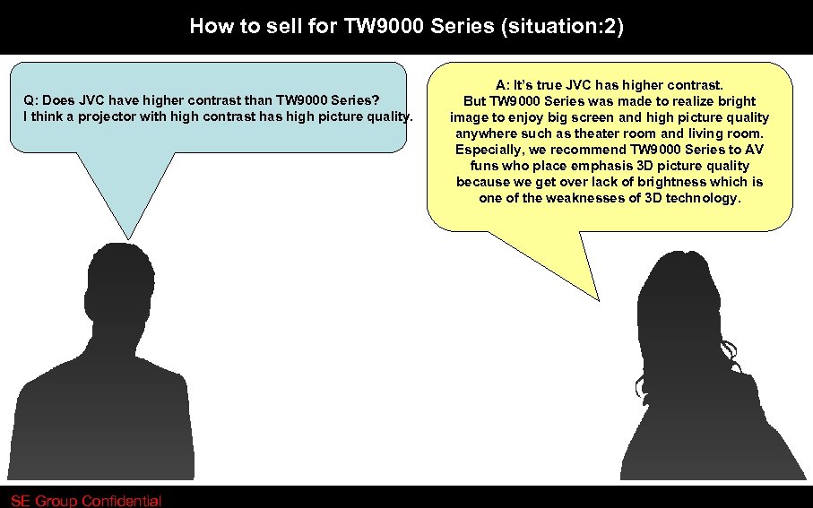 How to sell for TW 9000 Series (situation: 2) Q: Does JVC have higher contrast than TW 9000 Series? I think a projector with high contrast has high picture quality. SE Group Confidential A: It’s true JVC has higher contrast. But TW 9000 Series was made to realize bright image to enjoy big screen and high picture quality anywhere such as theater room and living room. Especially, we recommend TW 9000 Series to AV funs who place emphasis 3 D picture quality because we get over lack of brightness which is one of the weaknesses of 3 D technology.
