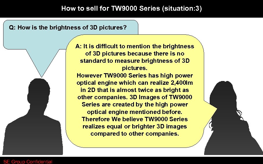 How to sell for TW 9000 Series (situation: 3) Q: How is the brightness of 3 D pictures? A: It is difficult to mention the brightness of 3 D pictures because there is no standard to measure brightness of 3 D pictures. However TW 9000 Series has high power optical engine which can realize 2, 400 lm in 2 D that is almost twice as bright as other companies. 3 D Images of TW 9000 Series are created by the high power optical engine mentioned before. Therefore We believe TW 9000 Series realizes equal or brighter 3 D images compared to other companies. SE Group Confidential