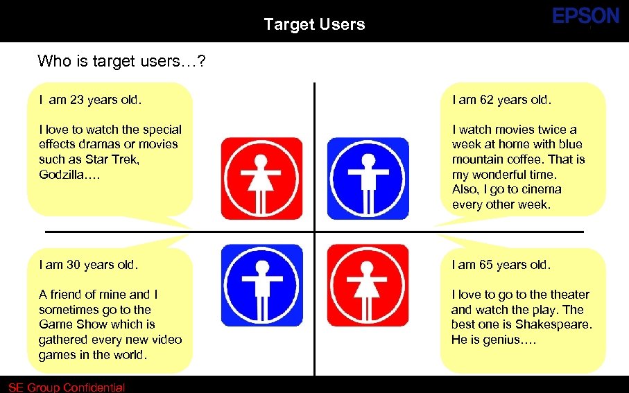 Target Users Who is target users…? I am 23 years old. I am 62 years old. I love to watch the special effects dramas or movies such as Star Trek, Godzilla…. I watch movies twice a week at home with blue mountain coffee. That is my wonderful time. Also, I go to cinema every other week. I am 30 years old. I am 65 years old. A friend of mine and I sometimes go to the Game Show which is gathered every new video games in the world. I love to go to theater and watch the play. The best one is Shakespeare. He is genius…. SE Group Confidential