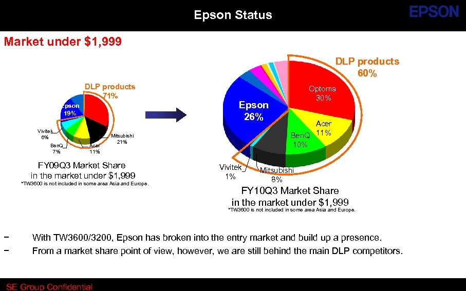 Epson Status Market under $1, 999 DLP products 60% DLP products 71% Epson 19% Optoma 32% Vivitek 6% Ben. Q 7% Acer 11% Epson 26% Mitsubishi 21% FY 09 Q 3 Market Share in the market under $1, 999 *TW 3600 is not included in some area Asia and Europe. Vivitek 1% Optoma 30% Acer Ben. Q 11% 10% Mitsubishi 8% FY 10 Q 3 Market Share in the market under $1, 999 *TW 3600 is not included in some area Asia and Europe. − − With TW 3600/3200, Epson has broken into the entry market and build up a presence. From a market share point of view, however, we are still behind the main DLP competitors. SE Group Confidential
