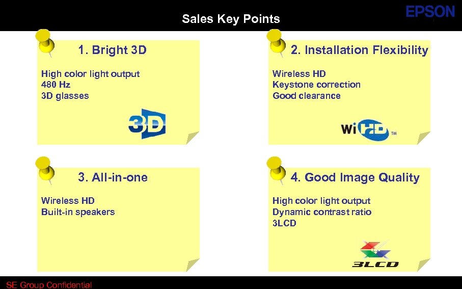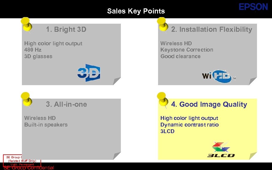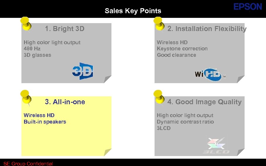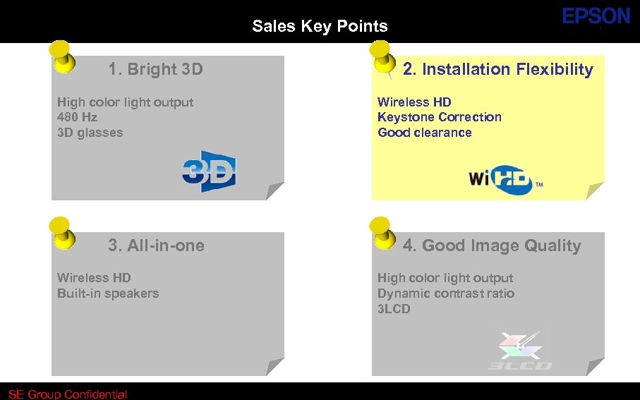 Sales Key Points 1. Bright 3 D High color light output 480 Hz 3 D glasses 3. All-in-one Wireless HD Built-in speakers SE Group Confidential (Related Staff Only) Until : Permanent SE Group Confidential 2. Installation Flexibility Wireless HD Keystone Correction Good clearance 4. Good Image Quality High color light output Dynamic contrast ratio 3 LCD
