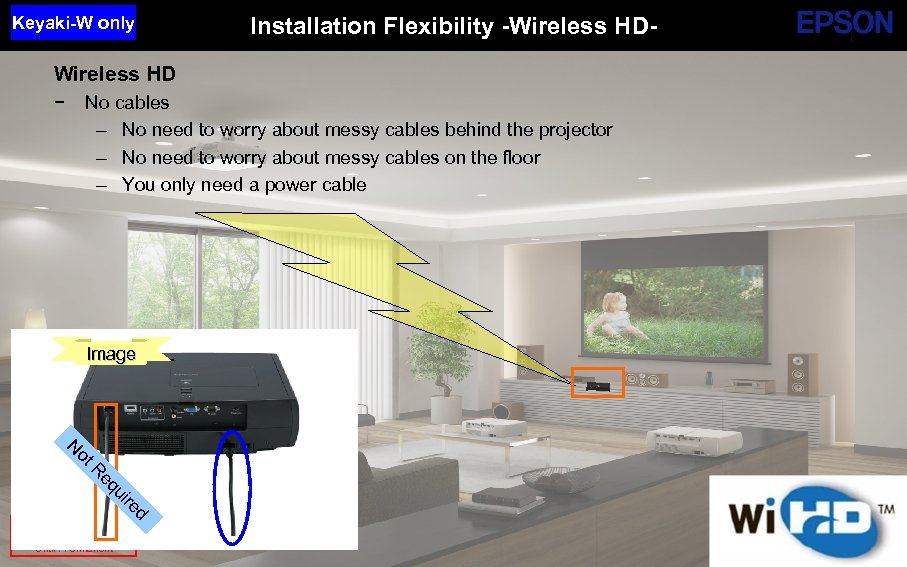 Keyaki-W only Installation Flexibility -Wireless HD- Wireless HD − No cables – No need to worry about messy cables behind the projector – No need to worry about messy cables on the floor – You only need a power cable Image ot N d re ui eq R SE Group Confidential (Related Staff Only) Until : Permanent SE Group Confidential
