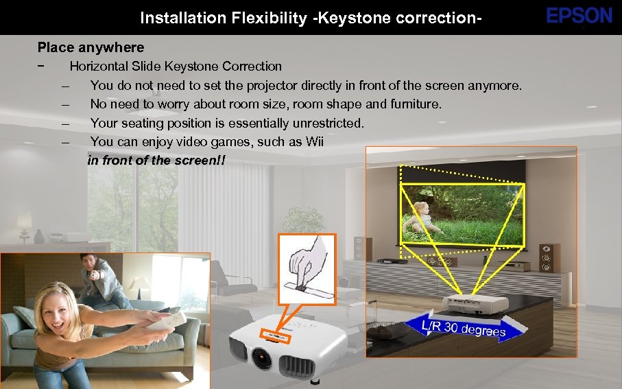 Installation Flexibility -Keystone correction. Place anywhere − Horizontal Slide Keystone Correction – You do not need to set the projector directly in front of the screen anymore. – No need to worry about room size, room shape and furniture. – Your seating position is essentially unrestricted. – You can enjoy video games, such as Wii in front of the screen!! SE Group Confidential (Related Staff Only) Until : Permanent SE Group Confidential